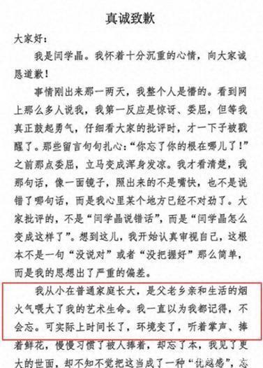 道歉信里她表示自己的思想出现了严重的偏差,被人捧习惯了,忘了本。